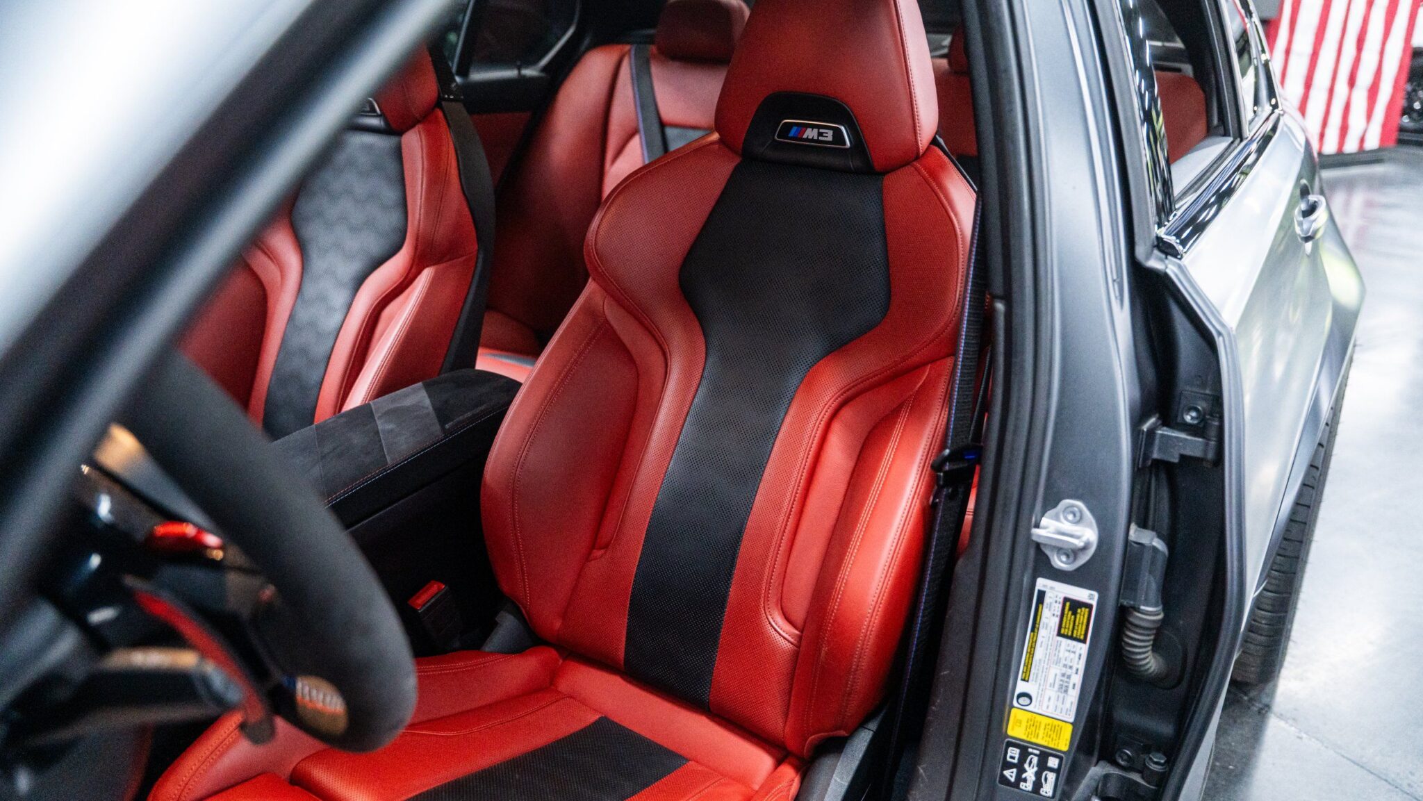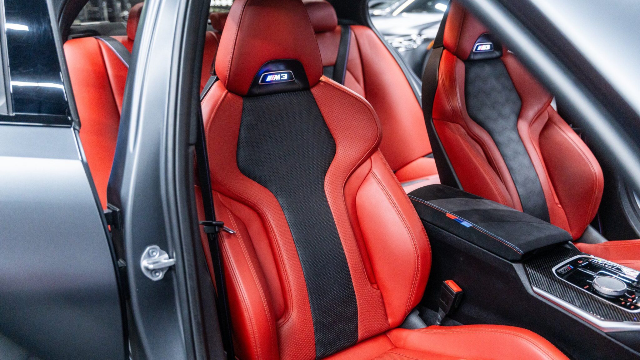 Experience the pinnacle of performance and luxury with the 2022 BMW M3 Competition xDrive Sedan. Cloaked in a stunning Individual Dravit Grey Metallic, this sedan is powered by a robust 3.0L 6-cylinder engine delivering an exhilarating 503 horsepower. The all-wheel-drive system ensures unparalleled handling and control, making every drive unforgettable. Step inside to find M Sport Seats adorned in Fiona Red/Black leather, offering both heated and ventilated options for ultimate comfort. With power-adjustable features including lumbar support for both driver and passenger seats, your journey will be as comfortable as it is thrilling.